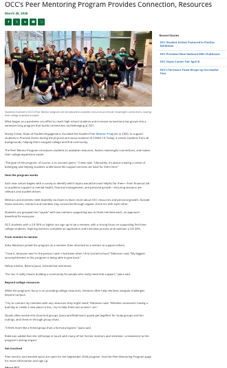 Article on Oakland Community College’s Student Peer Mentor Program.